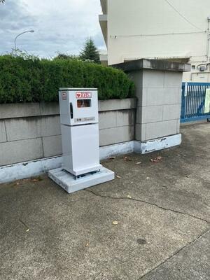 夏休み中、順番に工事が行われ、本校の正門前にも設置されました。これにより、24時間誰でも使用可能となり、万が一の事態が発生した際に迅速な対応が可能となりました。ありがとうございました。